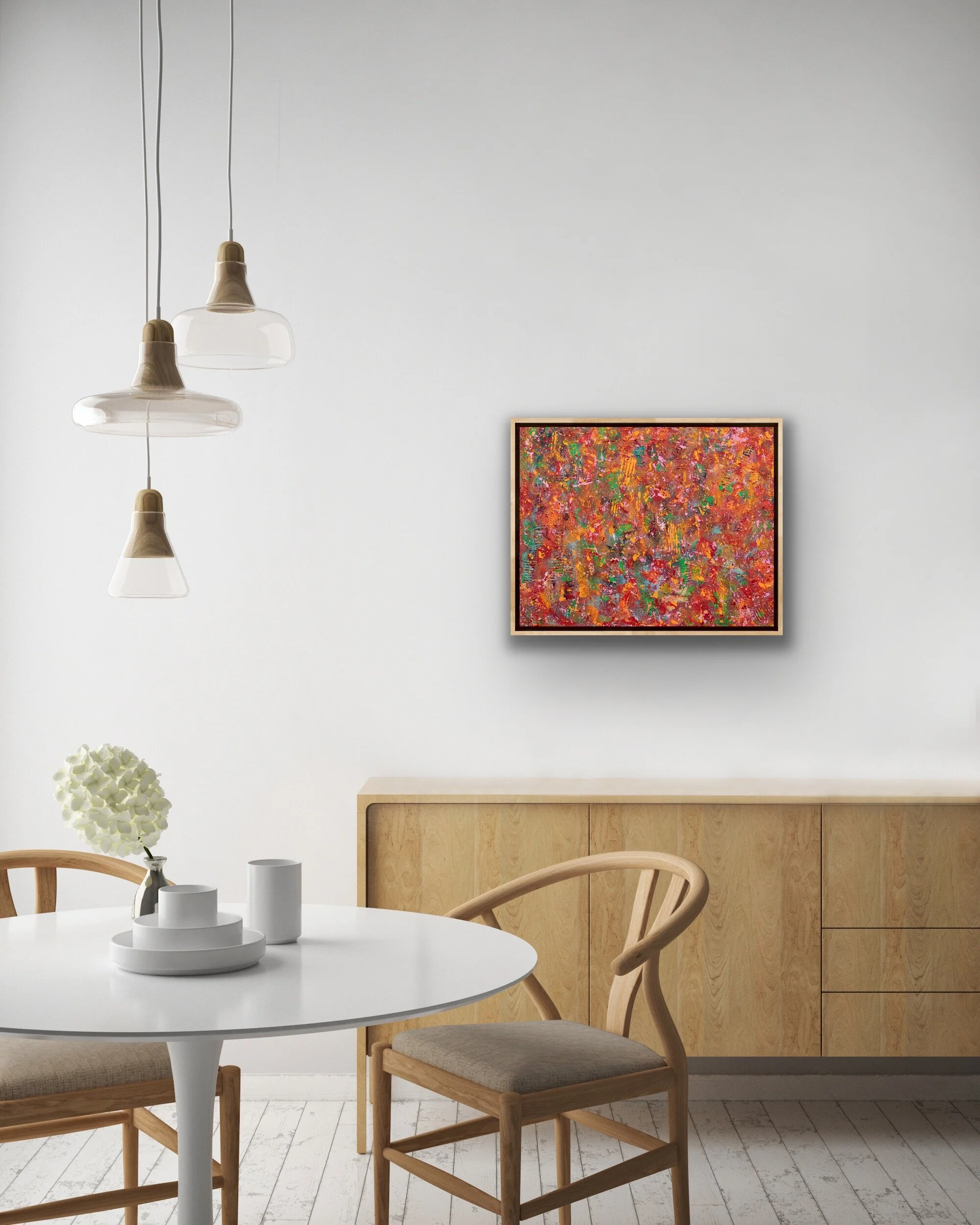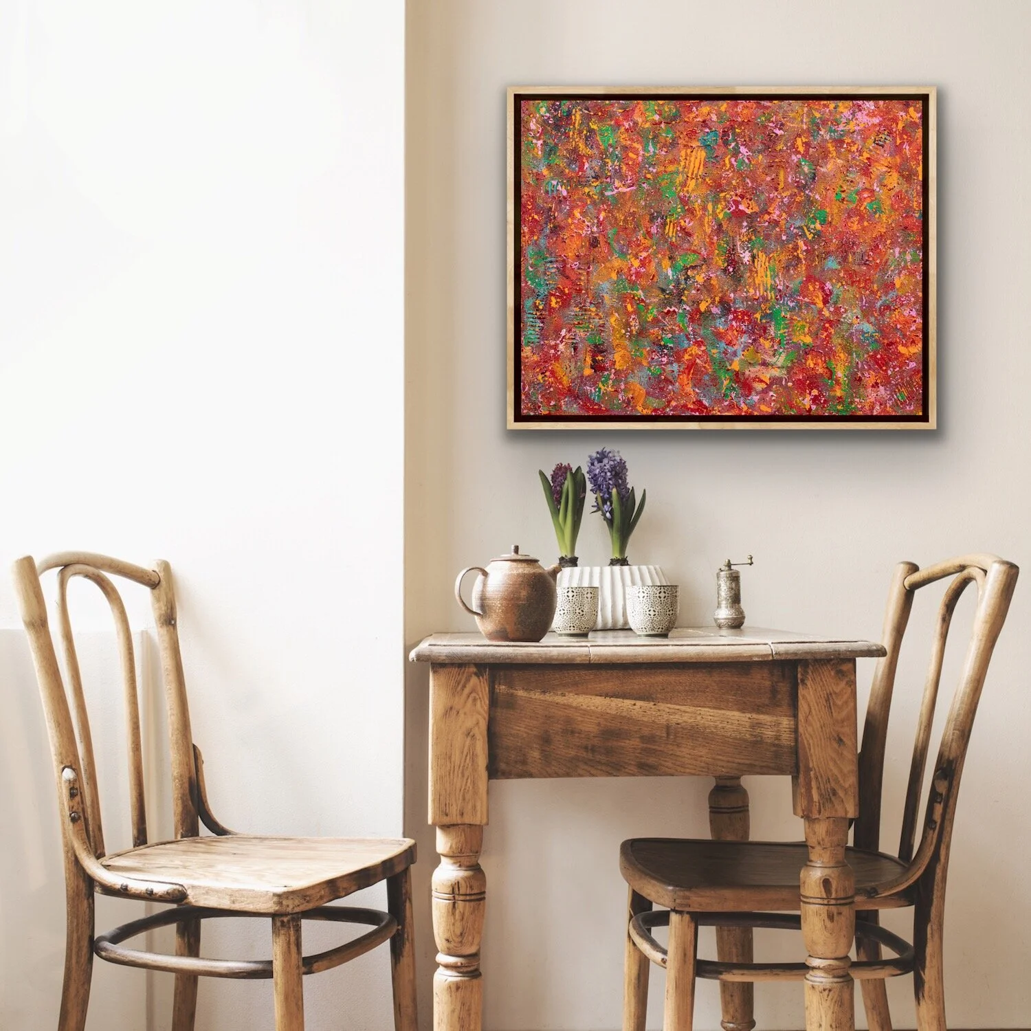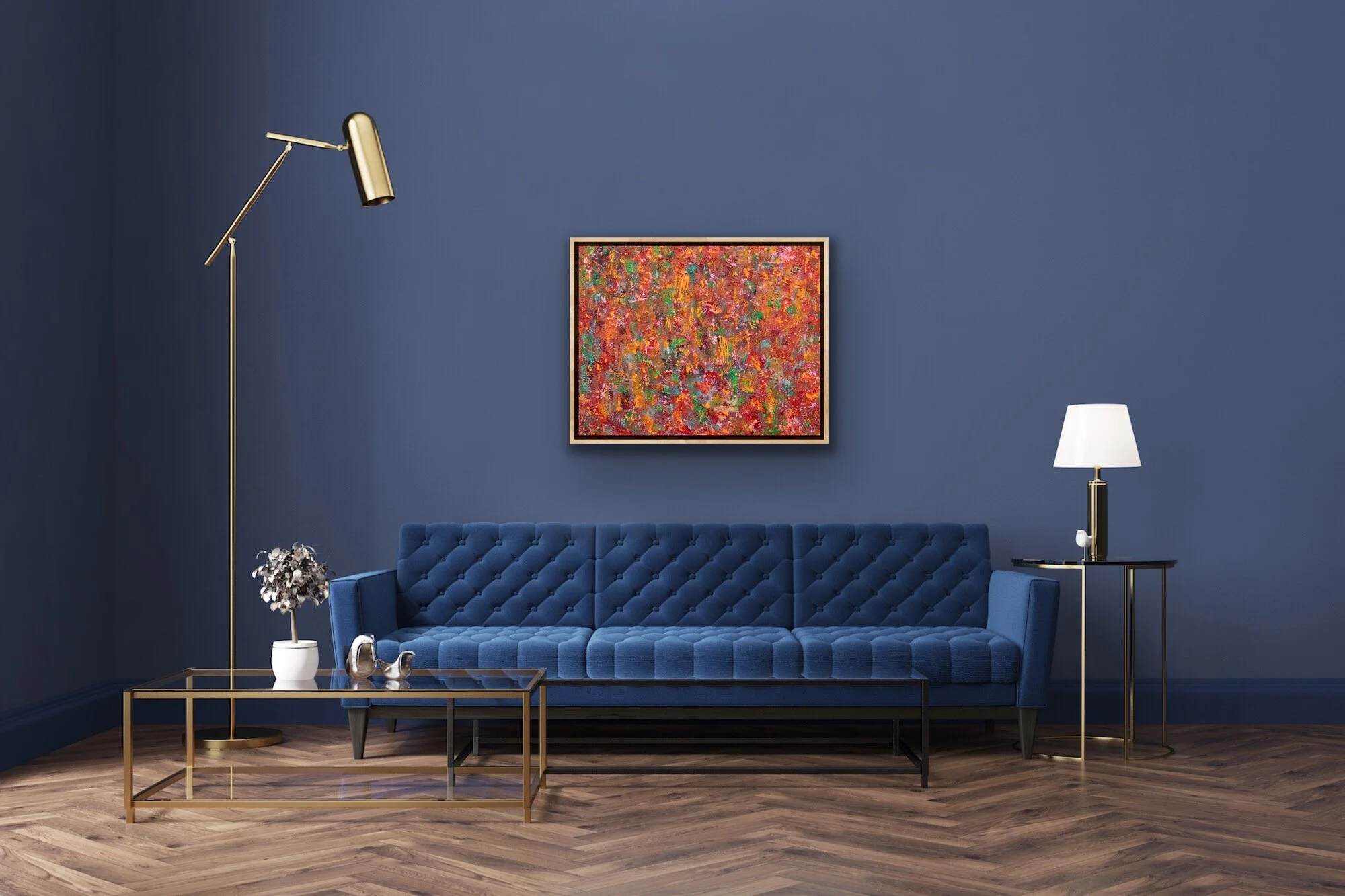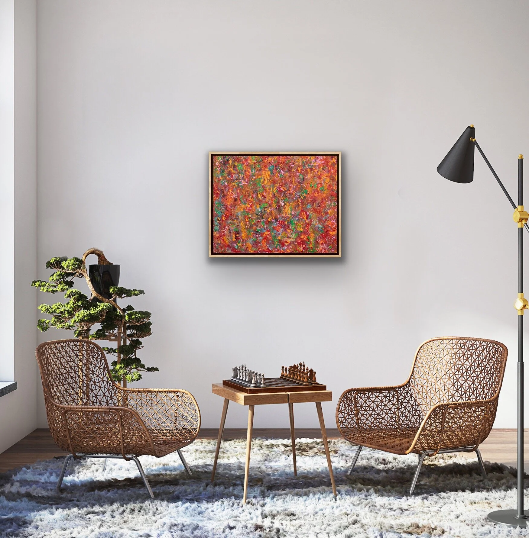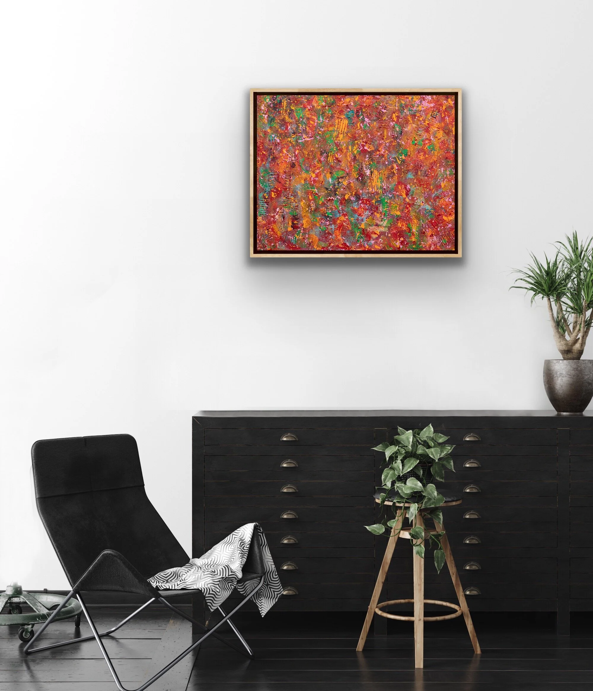 This is the original abstract painting on stretched archival quality canvas. It is framed on a golden-brushed custom high-quality 0.5” wide floater frame.